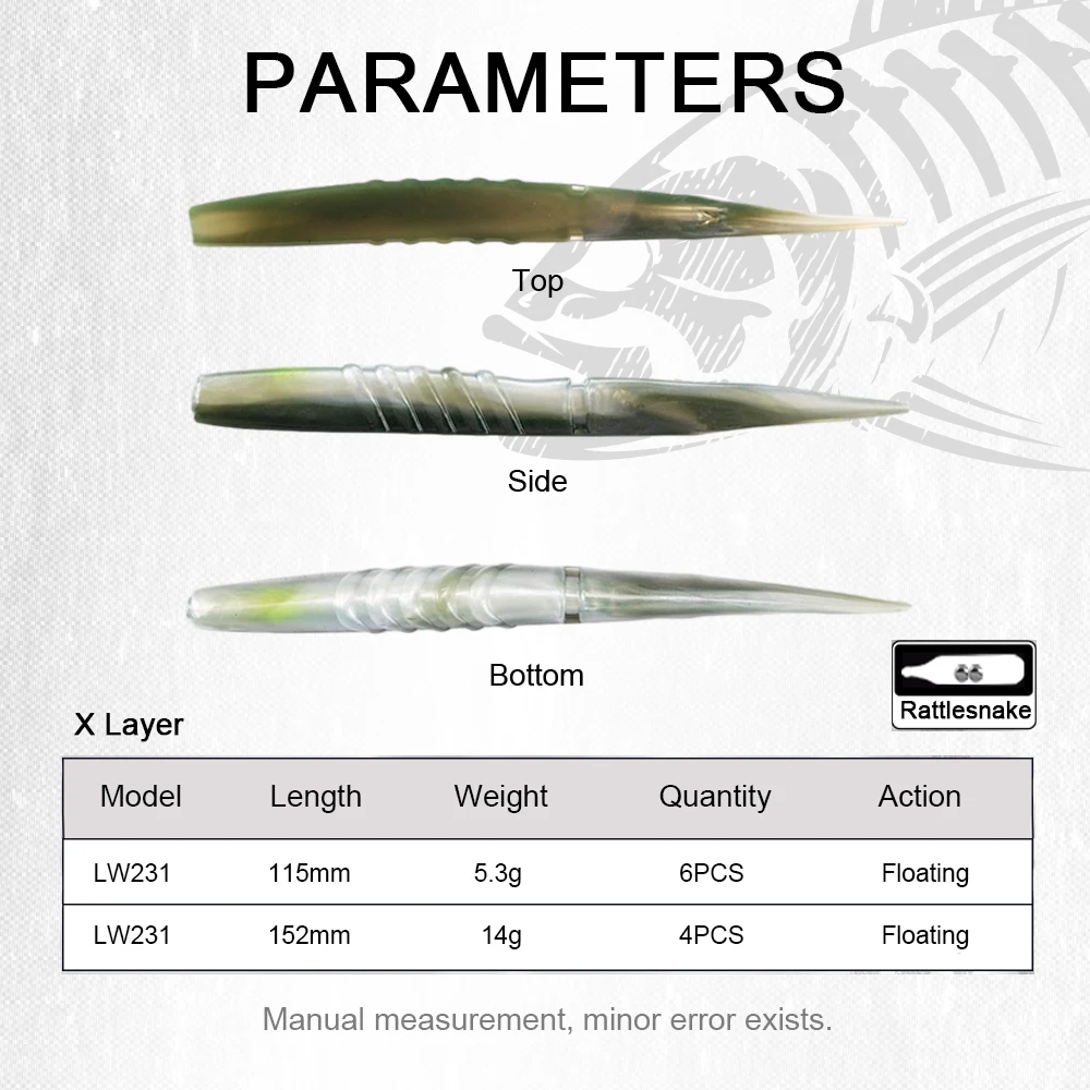 Hunthouse layers Soft Fishing Lure Floating 6PCS/4PCS Silicone Bait 110mm 150mm Rattling Tail For Pike Bass Fish Tackle LW231